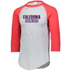 4.8 ounce 50% polyester/50% cotton jersey knit; Tear away label; Crew neck; 3/4″ length raglan sleeves; Serged fishtail bottom