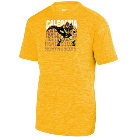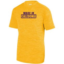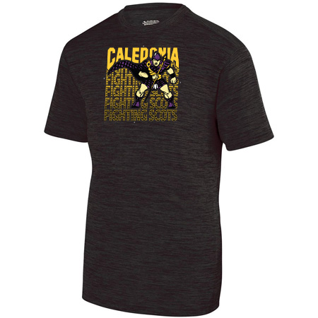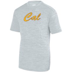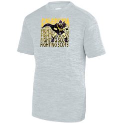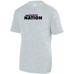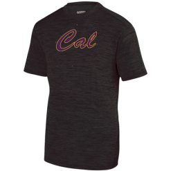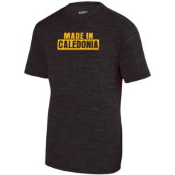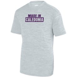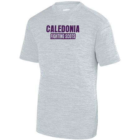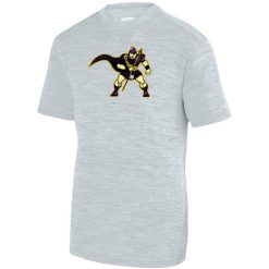 100% polyester heathered wicking knit; Wicks moisture; Tagless label; Crew neck; Set-in sleeves