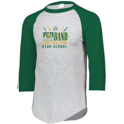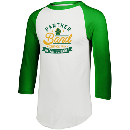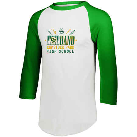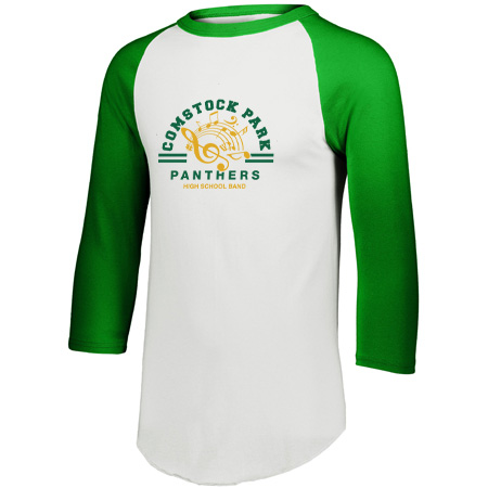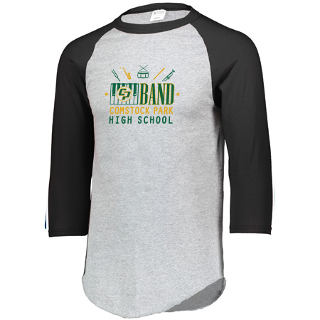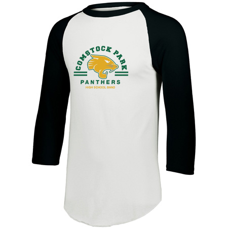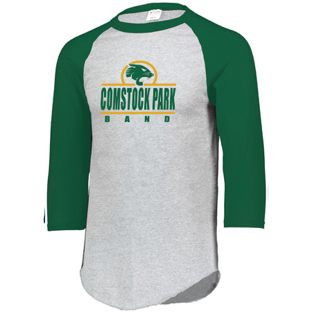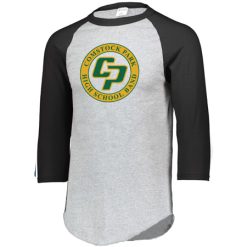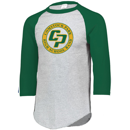 4.8 ounce 50% polyester/50% cotton jersey knit; Tear away label; Crew neck; 3/4″ length raglan sleeves; Serged fishtail bottom