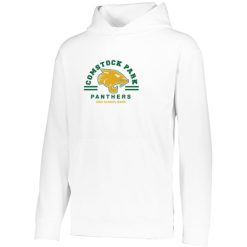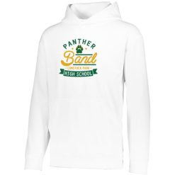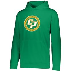 5.9 ounce 100% polyester performance wicking fleece; Wicks moisture; Tear away label; Self-lined hood with drawcord on Adult sizes only; Set-in sleeves; Front pouch pocket; Self-fabric cuffs and bottom band