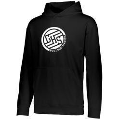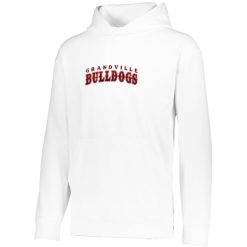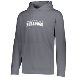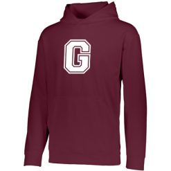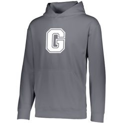 5.9 ounce 100% polyester performance wicking fleece; Wicks moisture; Tear away label; Self-lined hood with drawcord on Adult sizes only; Set-in sleeves; Front pouch pocket; Self-fabric cuffs and bottom band
