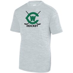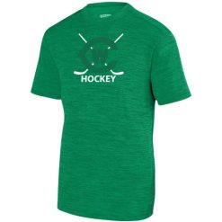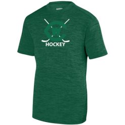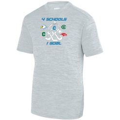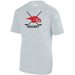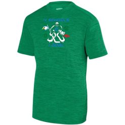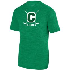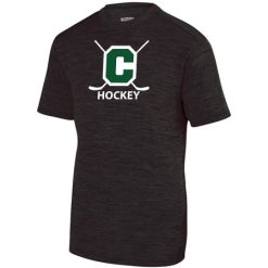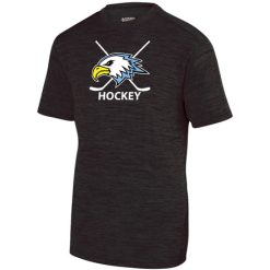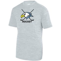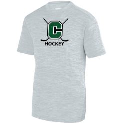 100% polyester heathered wicking knit; Wicks moisture; Tagless label; Crew neck; Set-in sleeves