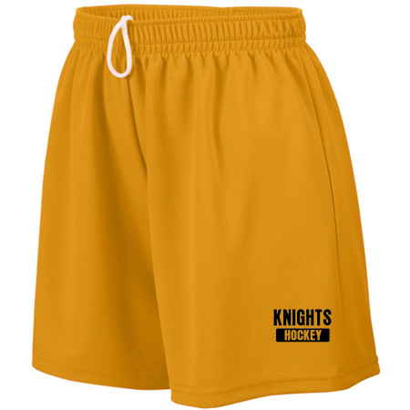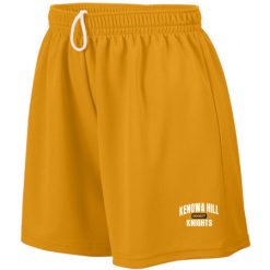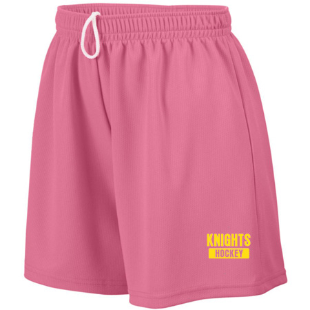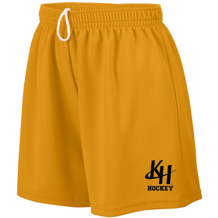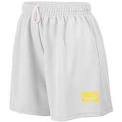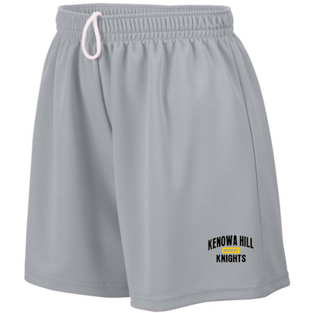 100% polyester wicking mesh; Wicks moisture; Ladies’ fit; Covered elastic waistband with inside drawcord; 5-inch inseam; Girls inseam graded