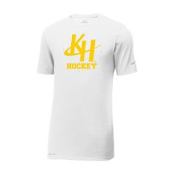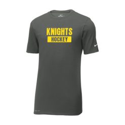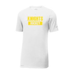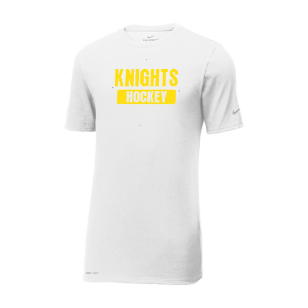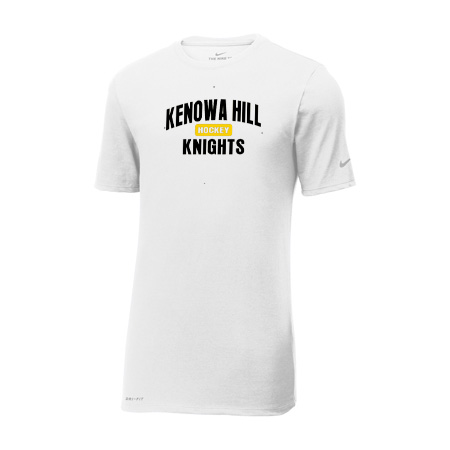 This Nike performance tee features sweat-wicking fabric to help keep you dry and comfortable. Durable rib knit crew neck. Heat transfer label for tag-free comfort. Double-needle stitching throughout. Contrast heat transfer Swoosh design trademark on left sleeve. Contrast heat transfer Dri-FIT logo at right hem. Made of 4.7-ounce, 60/40 cotton/poly Dri-FIT fabric.