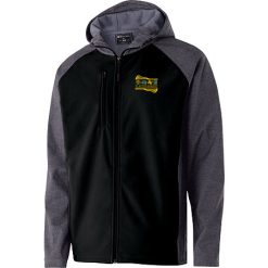 ightweight, soft shell outer fabric in 96% polyester, 4% spandex bonded to brushed back polyester. Sleeves, hood and panels have Tech Print pattern detail; Woven label; Front zipper; Adjustable hood with drawcord; Dual front chest zippered pocket; Dual inside pockets; Internal storm cuffs for weather protection; Front zippered pockets; Open bottom with adjustable elastic hidden drawcord; Dropped tail