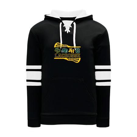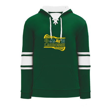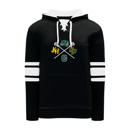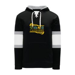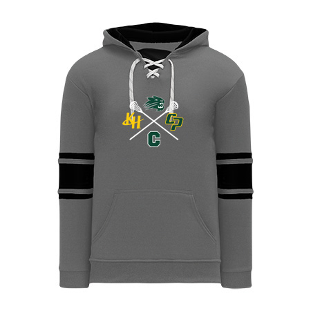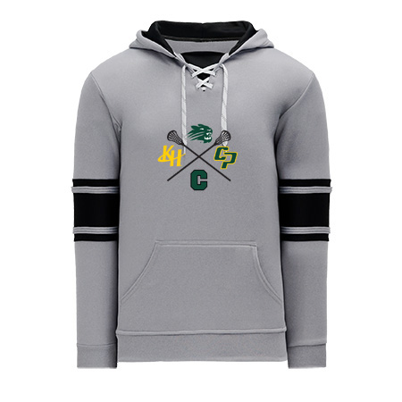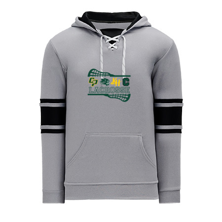 Polyfleece, rib knit fabrics. Features skate lace neck hood.