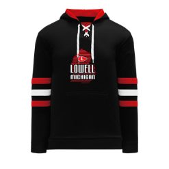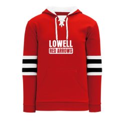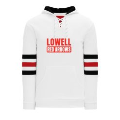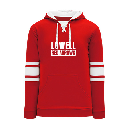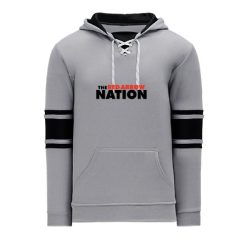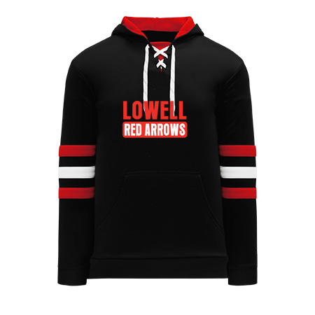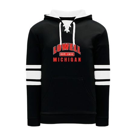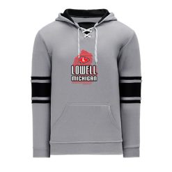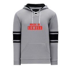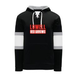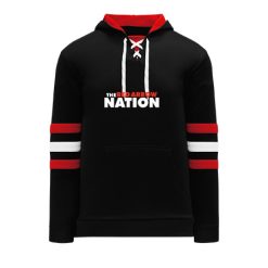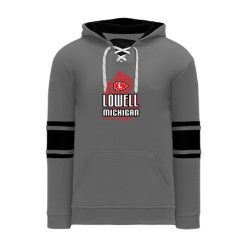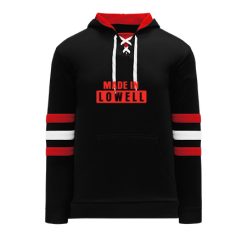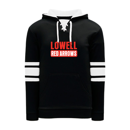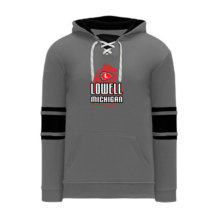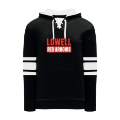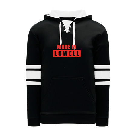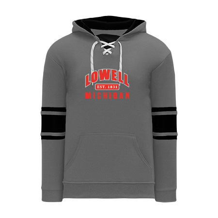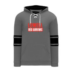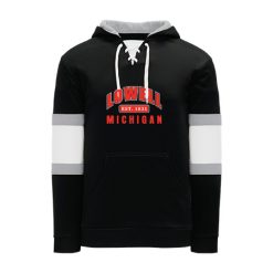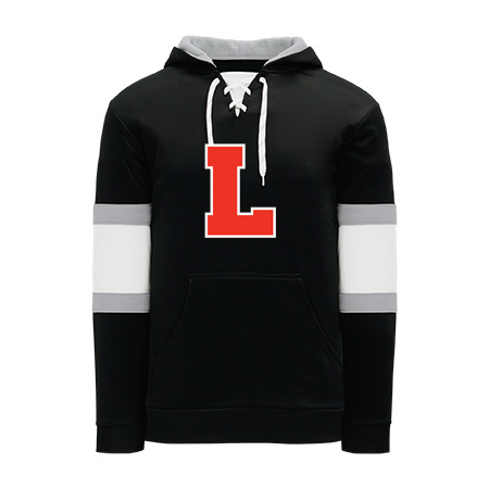Polyfleece, rib knit fabrics. Features skate lace neck hood.