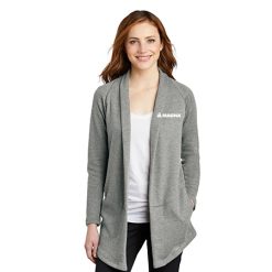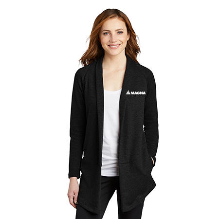 4.4-ounce, 62/33/5 poly/rayon/spandex – Button tab on sleeves – Shawl collar – Sloping front hem