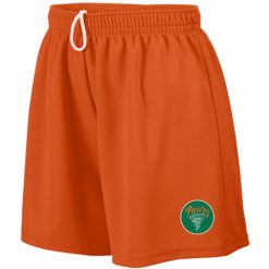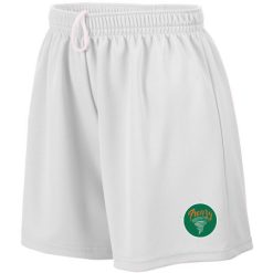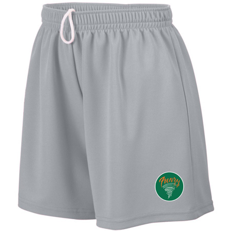 100% polyester wicking mesh; Wicks moisture; Ladies’ fit; Covered elastic waistband with inside drawcord; 5-inch inseam; Girls inseam graded