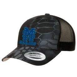 65% polyester / 35% cotton, Hard buckram. Structured, Mid profile, 6 panel, Curved visor, 3 ½” crown