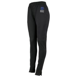 Heavyweight 100% polyester matte brushed tricot; Ladies’ fit; Woven label; Covered elastic waistband with inside drawcord; Side seam pockets; Tapered fit; Back yoke; Zipper on outside lower leg