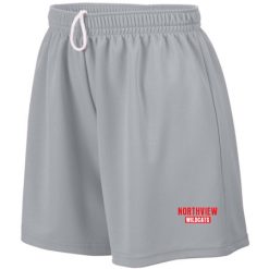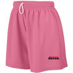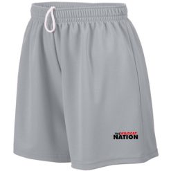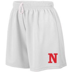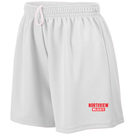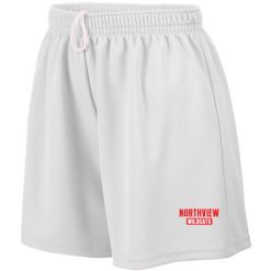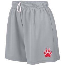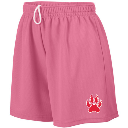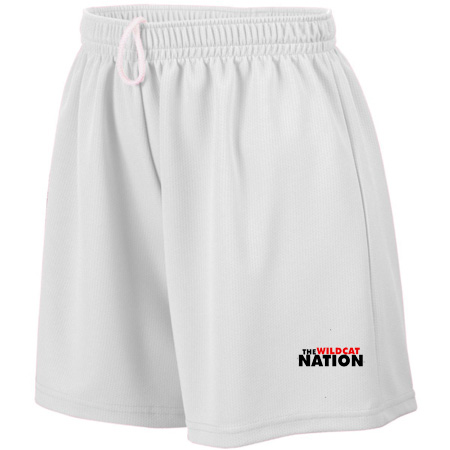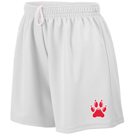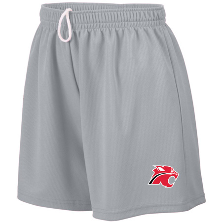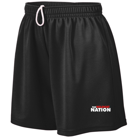 100% polyester wicking mesh; Wicks moisture; Ladies’ fit; Covered elastic waistband with inside drawcord; 5-inch inseam; Girls inseam graded