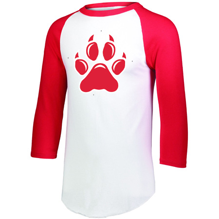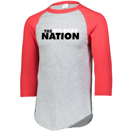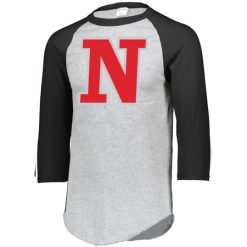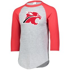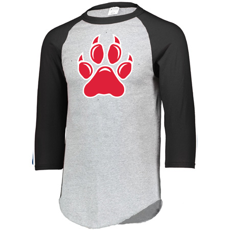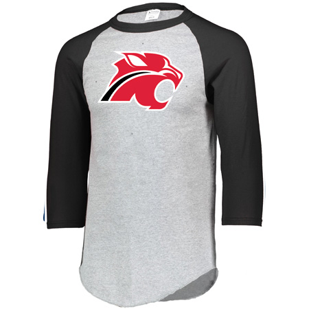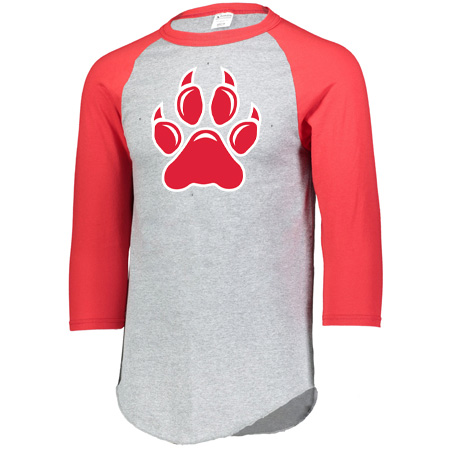 4.8 ounce 50% polyester/50% cotton jersey knit; Tear away label; Crew neck; 3/4″ length raglan sleeves; Serged fishtail bottom
