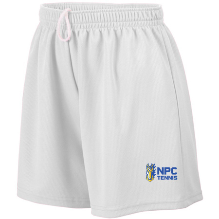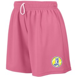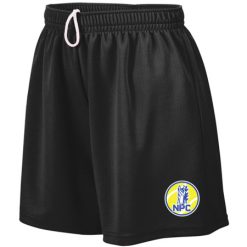 100% polyester wicking mesh; Wicks moisture; Ladies’ fit; Covered elastic waistband with inside drawcord; 5-inch inseam; Girls inseam graded