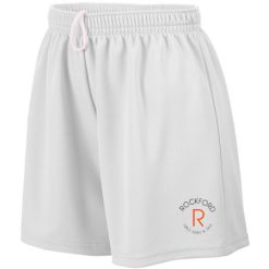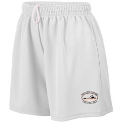 100% polyester wicking mesh; Wicks moisture; Ladies’ fit; Covered elastic waistband with inside drawcord; 5-inch inseam; Girls inseam graded