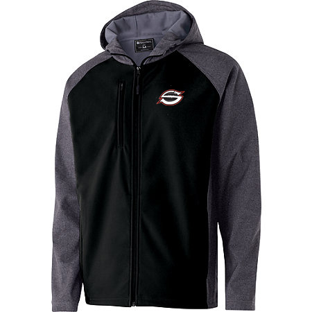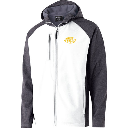 ightweight, soft shell outer fabric in 96% polyester, 4% spandex bonded to brushed back polyester. Sleeves, hood and panels have Tech Print pattern detail; Woven label; Front zipper; Adjustable hood with drawcord; Dual front chest zippered pocket; Dual inside pockets; Internal storm cuffs for weather protection; Front zippered pockets; Open bottom with adjustable elastic hidden drawcord; Dropped tail