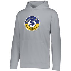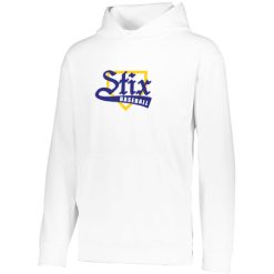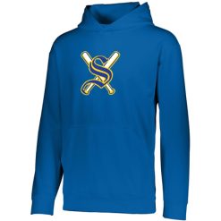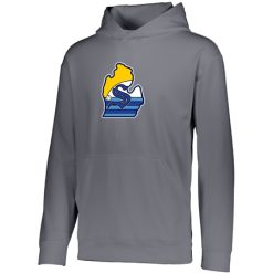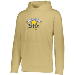 5.9 ounce 100% polyester performance wicking fleece; Wicks moisture; Tear away label; Self-lined hood with drawcord on Adult sizes only; Set-in sleeves; Front pouch pocket; Self-fabric cuffs and bottom band