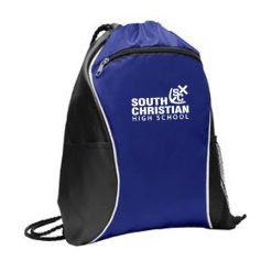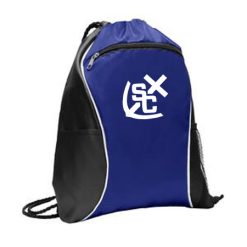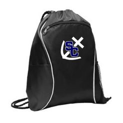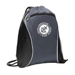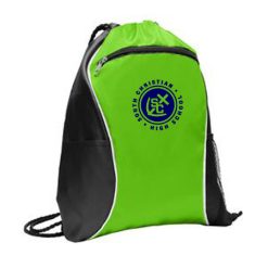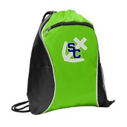 This spacious cinch pack is ready for any sport or activity. 210 denier polyester; Black drawcord closure; Front zippered pocket; Side mesh pocket; Side slip pocket; Dimensions: 16″h x 13″w