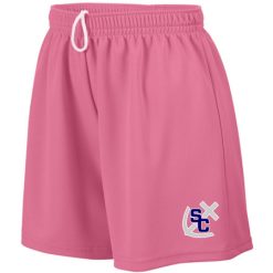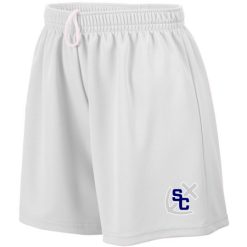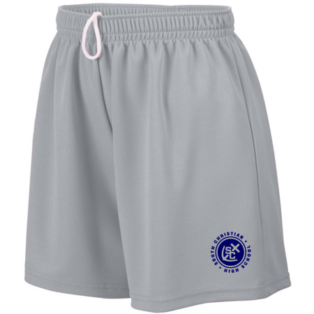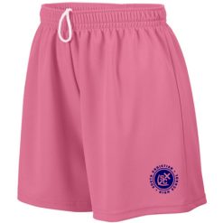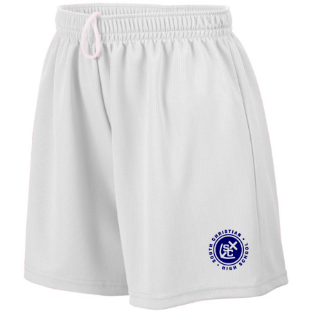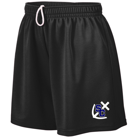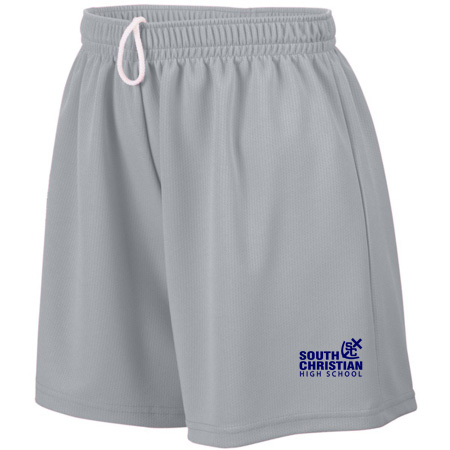 100% polyester wicking mesh; Wicks moisture; Ladies’ fit; Covered elastic waistband with inside drawcord; 5-inch inseam; Girls inseam graded